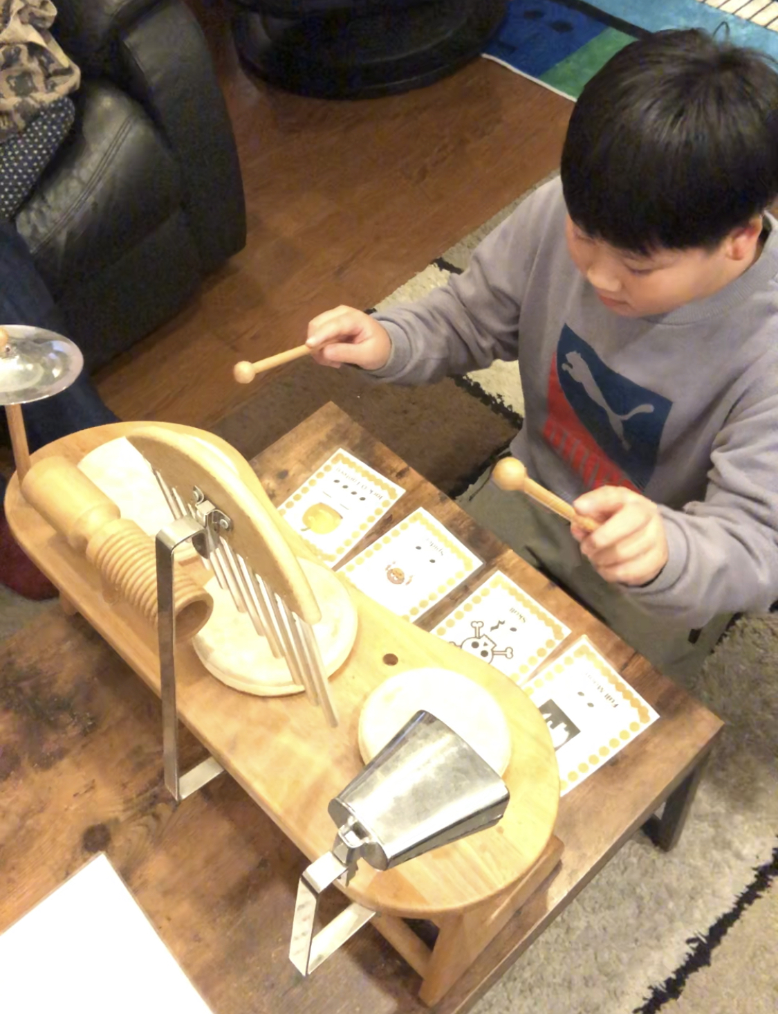ハロウィンのリズムカードを4枚選択、英単語を読みながら、みんなで Clap(手拍子)を回したり、ドラムポコ(ミニドラム)で演奏したり