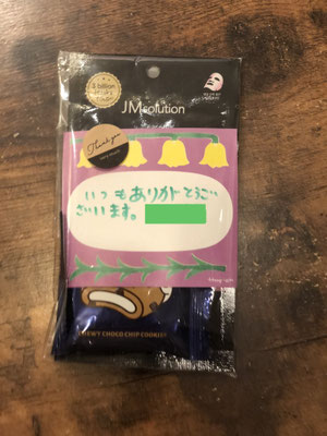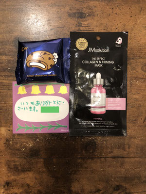 ↑はKくんからいただいたお菓子と顔の美容マスク。Cちゃんにも、同じような物を渡していました!