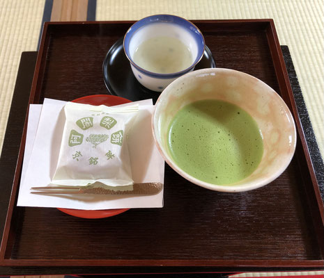こちらでお抹茶、お菓子(阿闍梨もち)をいただきました。